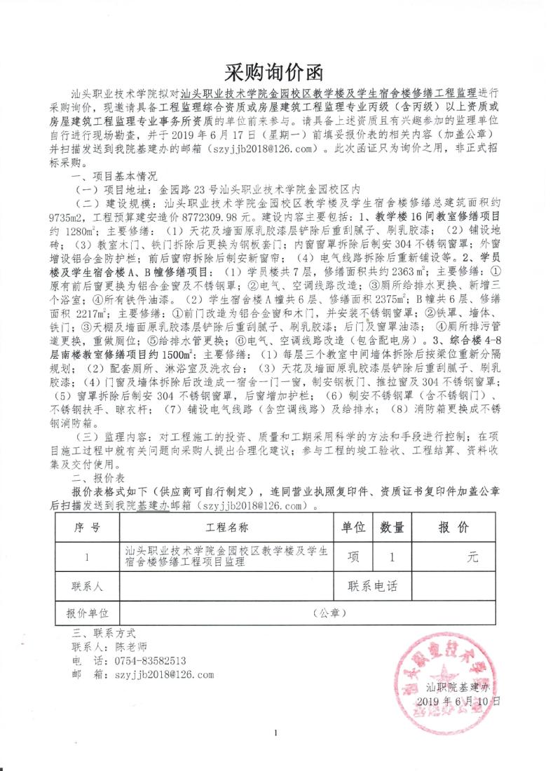 15vip太阳集团金园校区教学楼及学生宿舍楼修缮工程监理采购询价函