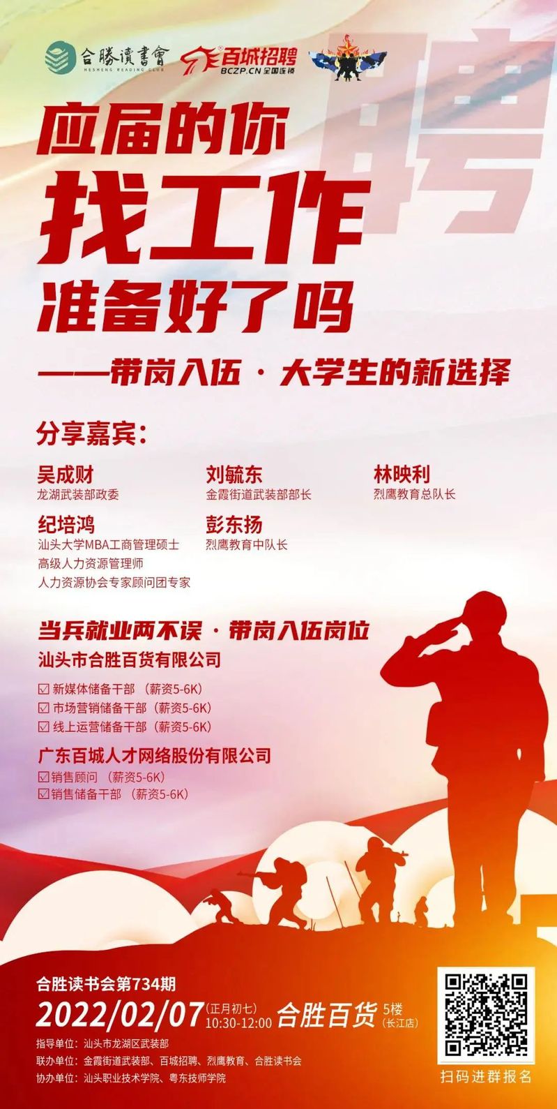本期读书会,我们将邀请龙湖武装部政委吴成财、金霞街道武装部部长刘毓东、汕头大学MBA工商管理硕士纪培鸿、烈鹰教育总队长林映利和烈鹰教育中队长彭东扬分别就大学生入伍优惠政策、应届生就业形势及职业发展规划、入伍当兵对人生的提升改变等内容进行分享,让就业服役不迷茫。